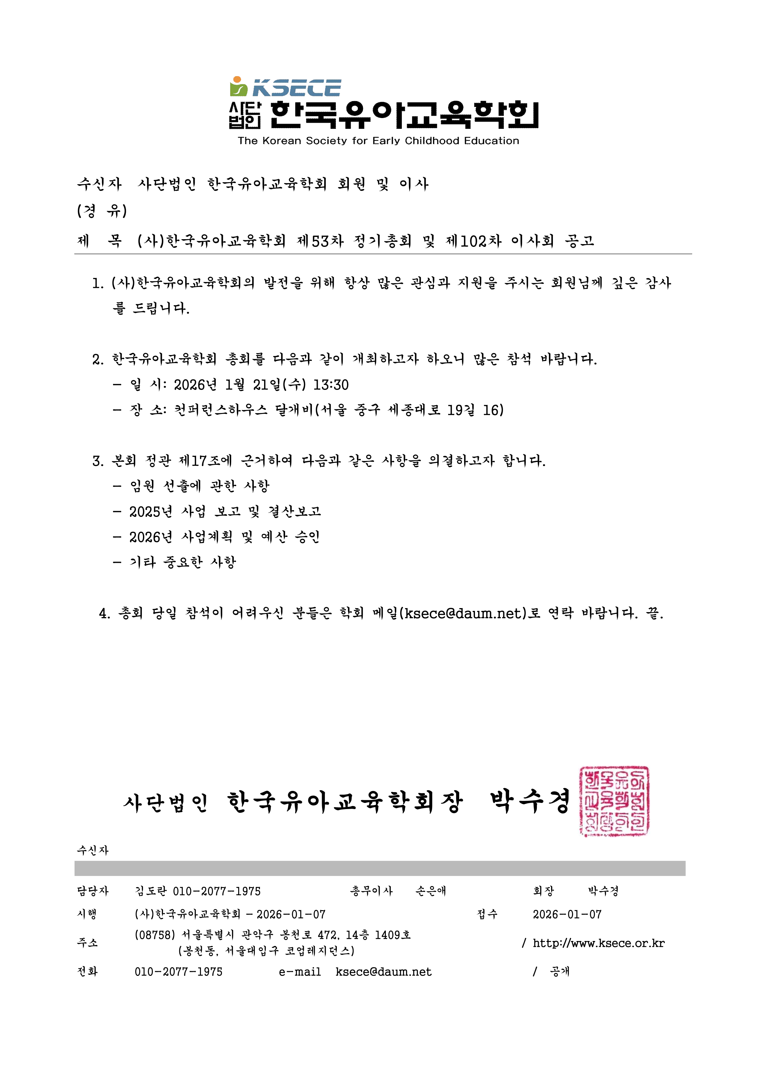 한국유아교육학회 제 53차 정기총회 및 제 102차 이사회 공고2026. 01. 07