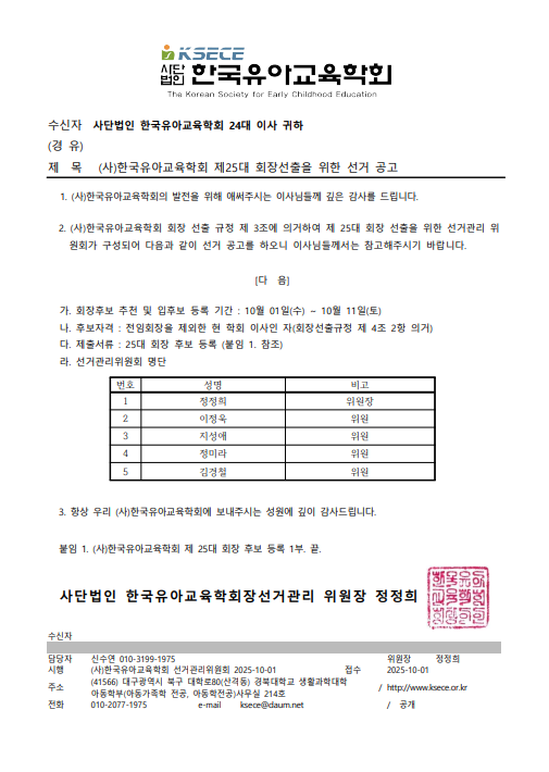 (사) 한국유아교육학회 제25대 선거관리위원회 구성 완료 및 회장 후보 모집 공고