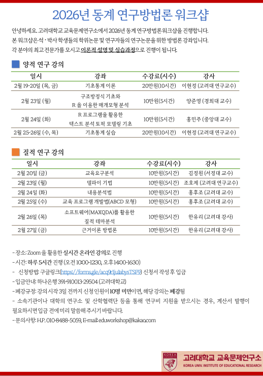 [고려대학교 교육문제연구소] 2026 동계 연구방법론 워크샵 안내
