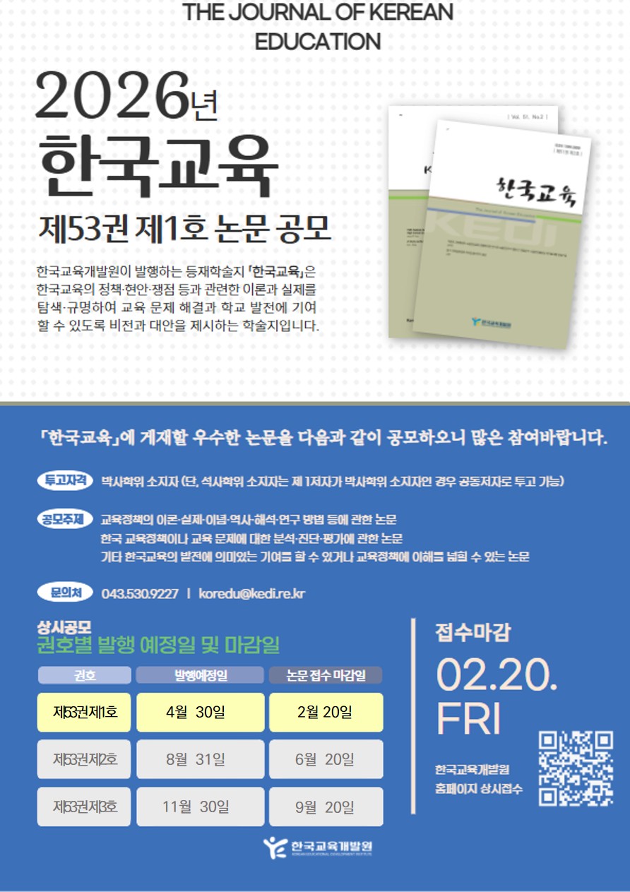 한국교육개발원이 발행하는 등재학술지 「한국교육」은 한국교육의 정책·현안·쟁점 등과 관련한 이론과 실제를 탐색·규명하여 교육 문제 해결과 학교 발전에 기여할 수 있도록 비전과 대안을 제시하는 학술지입니다.