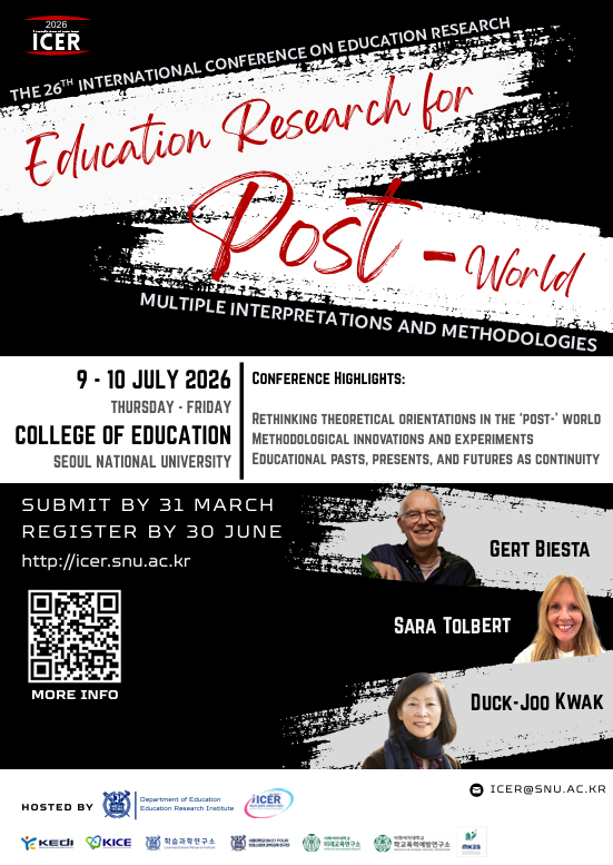 이번 ICER 2026는 “Education Research for the ‘Post-’ World: Multiple Interpretations and Methodologies”라는 주제로, 오늘날 교육 연구에서 ‘포스트-’가 무엇을 의미하는지, 또 ‘포스트-’ 세계의 교육과 그 주체를 이해하기 위한 어떠한 방법론적 도전과 혁신이 필요한지에 대해 논의하고자 합니다.